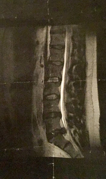 Comme on s’y attendait, après avoir pris les stéroïdes pendant deux jours, je pouvais de nouveau marcher et bouger, alors je suis retourné consulter mon médecin. Il a appelé un de ses amis (qui s’est avéré être un des meilleurs neurochirurgiens de la région, ainsi qu’un enseignant à l’université). Le chirurgien a dit que je devrais passer une IRM, ce que j’ai fait. J’ai apporté les résultats avec moi lors de ma visite. Le résultat de l’IRM montrait en détail la hernie discale.